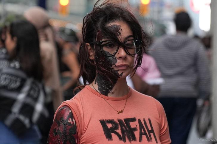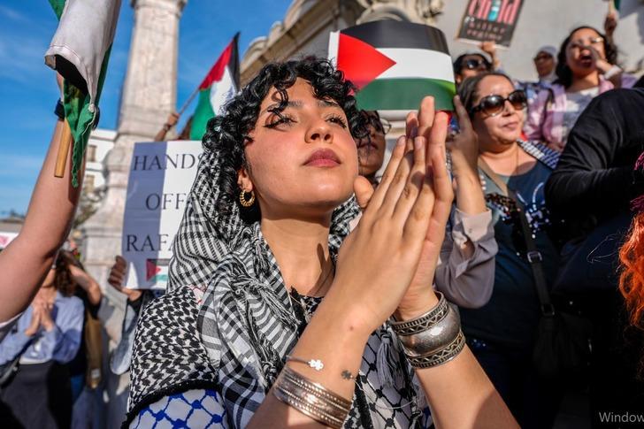 Göstericiler, İsrail ordusunun Refah kentinde yerinden edilmiş Filistinlilerin kampına düzenlediği saldırıya tepki gösterirken Filistin bayrağı ve savaş karşıtı pankartlar taşıdı.